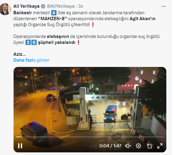İç işleri Bakanı Ali Yerlikaya aynı zamanda şunları ifade etti: ‘Aziz Milletimizin Bilmesini İsterim ki; Suçta kibirlenenlere, halkımızın huzurunu kaçıranlara, organize suç örgütlerine ve çetelere göz açtırmayacağız.
