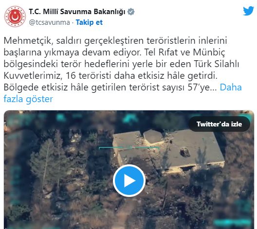 Mehmetçik, saldırı gerçekleştiren teröristlerin inlerini başlarına yıkmaya devam ediyor. Tel Rıfat ve Münbiç bölgesindeki terör hedeflerini yerle bir eden Türk Silahlı Kuvvetlerimiz, 16 teröristi daha etkisiz hâle getirdi. Bölgede etkisiz hâle getirilen terörist sayısı 57'ye yükseldi.