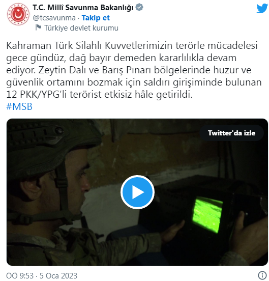 Kahraman Türk Silahlı Kuvvetlerimizin terörle mücadelesi gece gündüz, dağ bayır demeden kararlılıkla devam ediyor. Zeytin Dalı ve Barış Pınarı bölgelerinde huzur ve güvenlik ortamını bozmak için saldırı girişiminde bulunan 12 PKK/YPG'li terörist etkisiz hâle getirildi.
