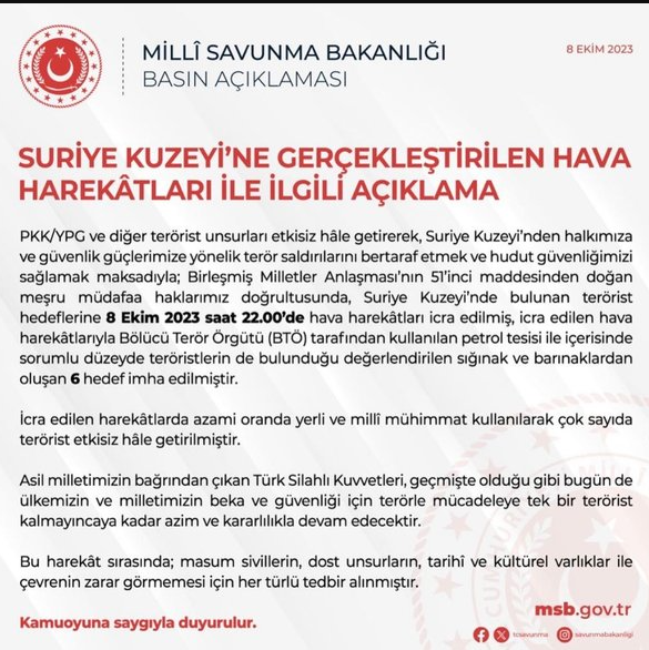 MSB açıklamasında şu ifadeler kullanıldı: PKK/YPG ve diğer terörist unsurları etkisiz hâle getirerek Suriye'nin kuzeyinden halkımıza ve güvenlik güçlerimize yönelik terör saldırılarını bertaraf etmek ve hudut güvenliğimizi sağlamak maksadıyla; Birleşmiş Milletler Anlaşması'nın 51'inci maddesinden doğan meşru müdafaa haklarımız doğrultusunda, Suriye'nin kuzeyinde bulunan terörist hedeflerine 8 Ekim 2023 saat 22.00'de hava harekâtları icra edilmiş, icra edilen hava harekâtlarıyla Bölücü Terör Örgütü (BTÖ) tarafından kullanılan petrol tesisi ile içerisinde sorumlu düzeyde teröristlerin de bulunduğu değerlendirilen sığınak ve barınaklardan oluşan 6 hedef imha edilmiştir.