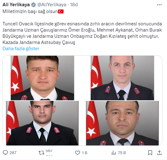 "Milletimizin başı sağ olsun, Tunceli Ovacık ilçesinde görev esnasında zırhlı aracın devrilmesi sonucunda Jandarma Uzman Çavuşlarımız Ömer Eroğlu, Mehmet Aykanat, Orhan Burak Büyükçaylı ve Jandarma Uzman Onbaşımız Doğan Kızılateş şehit olmuştur. Kazada Jandarma Astsubay Çavuş Muhammet Koyuncu yaralanmıştır. Şehitlerimize Allah'tan rahmet; ailelerine, kahraman Jandarma Teşkilatımıza ve Milletimize başsağlığı diliyorum. Kazada yaralanan kahramanımıza acil şifalar diliyorum. Şehitlerimizin makamları âli olsun"