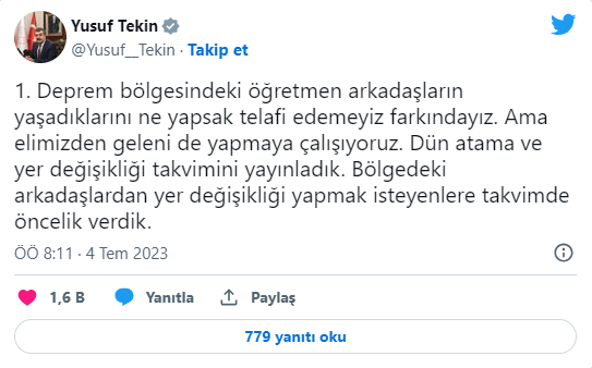 Tekin, sosyal medya hesabından yaptığı açıklamada, deprem bölgesindeki öğretmenlerin yaşadıklarını telafi edemeyeceklerinin farkında olduklarını, ancak ellerinden geleni yapmaya çalıştıklarını belirtti.