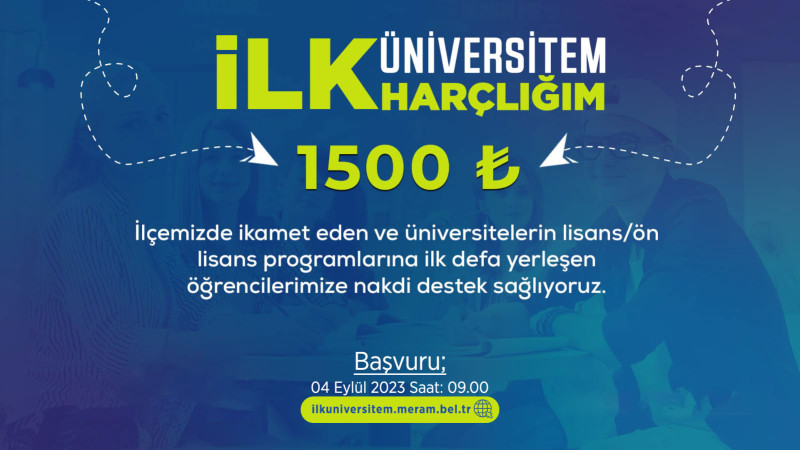 Meram Belediyesi, ilk kez geçtiğimiz eğitim öğretim yılında ‘İlk Üniversitem İlk Harçlığım’ sloganıyla hayata geçirdiği eğitim desteğini bu yıl da devam ettiriyor. Meram Belediye Başkanı Mustafa Kavuş, üniversiteyi ilk kez kazanan ve bir lisans ya da önlisans programına yerleşen tüm Meramlı öğrencilere bu eğitim öğretim yılı için bin 500 Bin TL nakit eğitim desteği verileceğinin müjdesini verdi. ilkuniversitem.meram.bel.tr internet adresi üzerinden yapılacak başvurular 4 Eylül Pazartesi günü başlıyor.