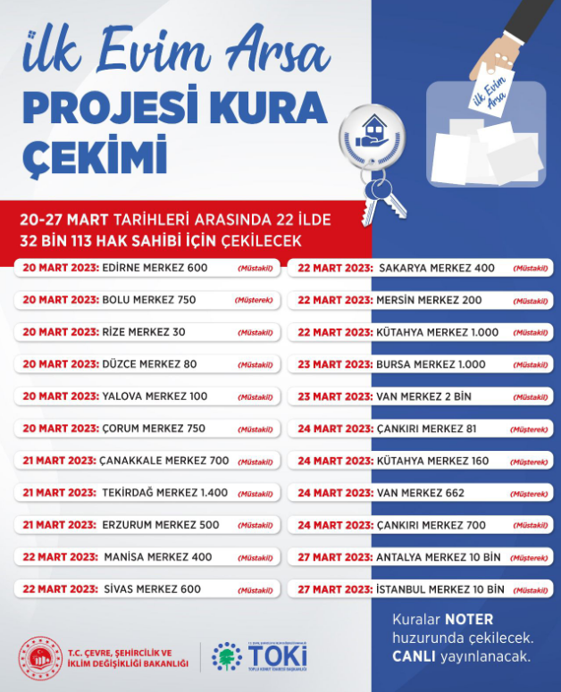 Bakanlık açıklamasında 20-27 Mart tarihleri arasında 32 bin 113 hak sahibi için müstakil ve müşterek arsa kuralarının noter huzurunda şu illerde çekileceği belirtildi: