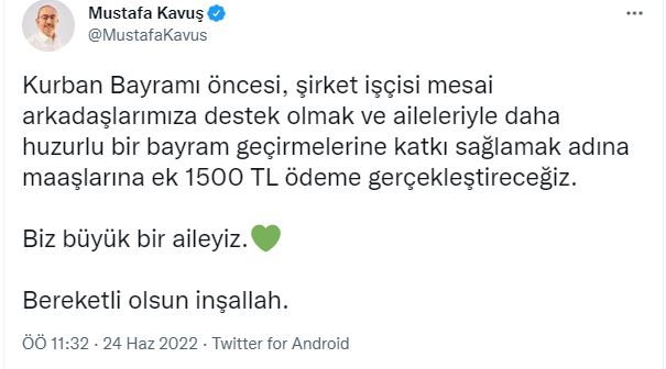 “Değerli mesai arkadaşlarım, şirket çalışanı arkadaşlarımıza destek olmak amacıyla Haziran ayı maaşıyla birlikte (tek sefere mahsus) net 1.500 TL ek ödeme yapmaya karar verdik. Bereketli olsun, güle güle harcayın. Tüm mesai arkadaşlarıma ve ailelerine selamlarımı iletiyorum. Biz hep birlikte büyük bir aileyiz.”