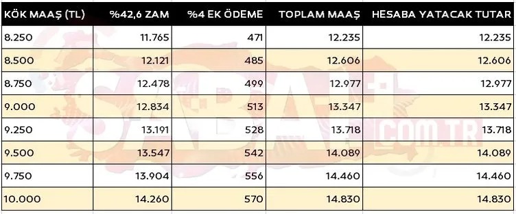 Zamlı emekli maaşları hesaplanırken, önce kök maaşa zam oranı uygulanıyor ardından yaklaşık yüzde 4'lük bir ek ödeme ilave ediliyor. Refah payı ile yüzde 42,6'lik zam oranı ve en düşük emekli maaşının 10 bin TL olması ile emekli kök maaş tablosu şöyle olacak: