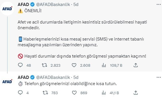 Son dakika haberi: Afet ve Acil Durum Yönetimi Başkanlığı (AFAD) Kahramanmaraş'ta geçekleşen ve çevre illerde de hissedilen 7.4'lük deprem sonrası kritik uyarıda bulundu. AFAD'dan yapılan açıklamada; "Afet ve acil durumlarda iletişimin kesintisiz sürdürülebilmesi hayati önemdedir. Hayati durumlar dışında telefon görüşmesi yapmaktan kaçının!" ifadelerine yer verildi.