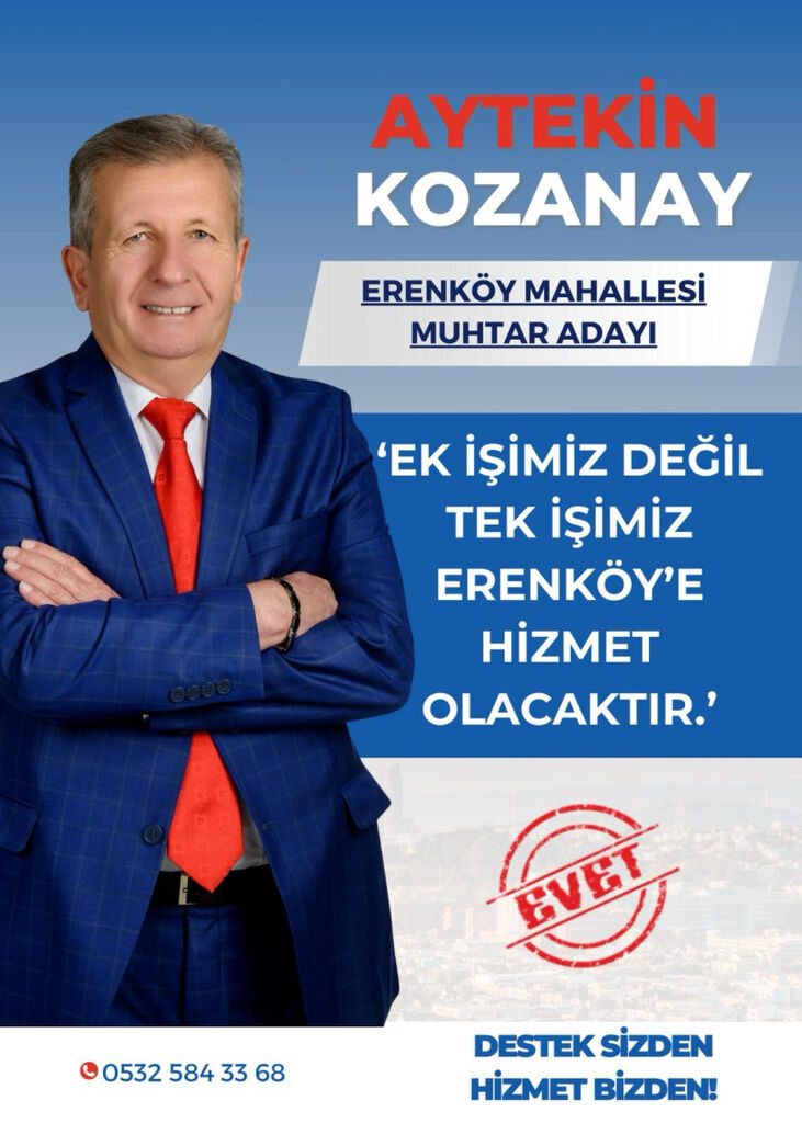 Kozanay:''Önceliğimiz mahallede yaşayan kadınlarımızın mahalle muhtarından isteği olan KOMEK dikiş nakış kursudur. Eğer göreve gelirsem KOMEK kurslarının açılması için gerekli yerlere başvurularımızı yapıp, mahallemize bu kursları kazandırmaya çalışacağım'' dedi.Kozanay,'' ikinci önceliğim vatandaşlarımız için Emekliler Konağı için düşündüğüm projemi hayata geçirmek.Erenköy mahallemizde bir emekliler konu olmadığı için cami cemaati boş vakitlerini geçirerek mekan bulamıyor. Bu konak onların özellikle talep ettiği bir projedir. Allah nasip ederse mahalle sakinlerimiz de bizi tercih ederse hayata geçireceğimiz projelerden birisi bu olacak'' şeklinde konuştu.