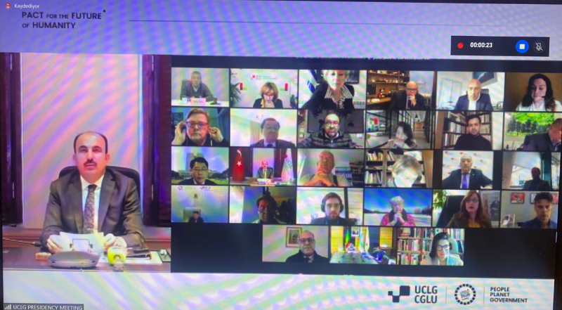 Birleşmiş Kentler ve Yerel Yönetimler Dünya Teşkilatı (UCLG) Başkanı ve Konya Büyükşehir Belediye Başkanı Uğur İbrahim Altay, teşkilatın yeni yılın ilk başkanlık toplantısında başkanlık üyeleriyle bir araya geldi. Telekonferans yöntemiyle düzenlenen toplantıda konuşan Başkan Altay, Ekim ayında yaptıkları UCLG Dünya Kongresinde çok önemli bir başarıya imza attıklarını dile getirerek, “Ayrışma ve kutuplaşma düşüncesinin hâkim olduğu bir dünyada güçlerimizi birleştirerek bir araya gelmemiz ve katılımlı olarak UCLG yönetiminde yer alacak olmamız, ‘daha iyi bir gelecek için’ çıktığımız bu yolda çok büyük bir adım olmuştur. Yaklaşık 5 milyar kentliyi temsil eden bir birliğin sorumluluğunu taşıyoruz. Bu nedenle her türlü kültüre ve geleneğe uygun, sürdürülebilir ve kapsayıcı politikalar ile hareket etmemiz gerekiyor. Kurmuş olduğumuz yeni başkanlık sisteminin bu denli çeşitli ve kapsayıcı olması ile farklı kültürleri, gelenekleri ve en önemlisi insanları daha iyi tanıma şansı bulacağız. Böylece ulaşmak istediğimiz sürdürülebilir geleceğe daha sağlam adımlar ile yürüyeceğiz.” diye konuştu.