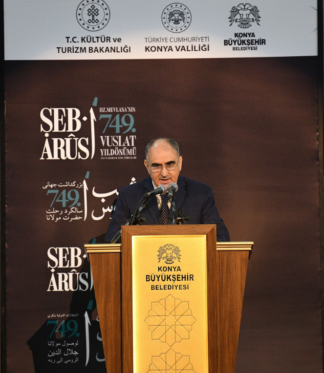 “ONUN İRFAN YOLU YOLDA KALMIŞLARA HER ASIRDA REHBERLİK ETMİŞTİR” Konya Valisi Vahdettin Özkan ise, Hz. Mevlânâ’nın bütün zamanları ve insanları kapsayan evrensel bir miras bıraktığını belirterek, “O, bütün insanlığı kucaklamış ve tüm insanlık tarafından kucaklanmıştır. Hiç kuşkusuz bugünün dijital çağ insanına da Hazreti Pir’in söyleyecekleri vardır. Onun yüzyıllar öncesinden gelen sesine kulak vermek, bir bilgelik ideali ve estetiğiyle dile getirdiği düşüncelerini anlayıp çözümlemek, irfanla dünyayı daha yaşanılabilir kılmak ve bunları yeni nesillere aktarmak için bizlere önemli görevler düşmektedir. Tarihimizin en önemli irfan kaynaklarından biri olan Hz. Mevlâna’nın günümüze ve geleceğe ışık tutan düşünceleri, insana ve yaşama ilişkin derinlikli söylemleri herkes için ufuk açıcıdır. Hz. Mevlânâ’nın asırlar önce tüm insanlık için çizdiği istikamet, modern toplumların bireye kazandırmayı hedeflediği değerleri de içermektedir. İnsanlık mirası olan bu hakikatler dün olduğu gibi, bugünkü insanın mayasında var olmaya devam etmektedir. Onun irfan yolu, yolda kalmışlara ve yol arayanlara her asırda rehberlik etmiştir. İnsanlara dostluk, sabır ve tahammül aşılamıştır. 749. Vuslat Yıldönümünde Hz. Mevlâna’yı rahmetle anıyorum. Anma Törenlerini teşrif eden siz değerli konuklarımızı muhabbetle selamlıyorum.” diye konuştu. Konuşmaların ardından Kültür ve Turizm Bakanlığı İstanbul Tarihi Türk Müziği Topluluğu Genel Sanat Yönetmeni Mehmet İhsan Özer, topluluk üyeleriyle Türk Tasavvuf Müziği konseri gerçekleştirirken, topluluğa sesiyle Devlet Sanatçısı Ahmet Özhan eşlik etti. Kültür ve Turizm Bakanlığı Konya Türk Tasavvuf Müziği Topluluğu tarafından ise “Mevlevi Ayini Şerifi” icra edildi.