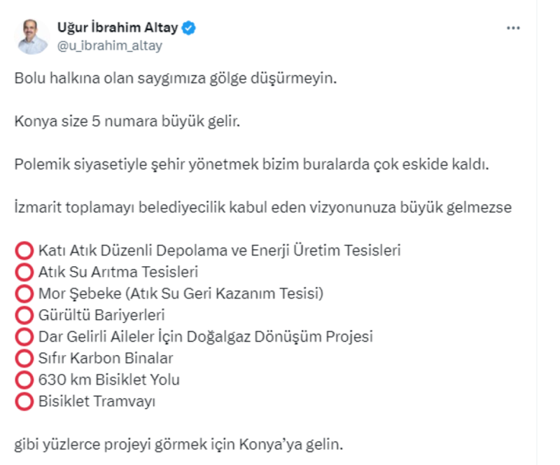 Konya büyükşehir Belediye başkanı Uğur İbrahim Altay’dan sosyal medyadan Konya ile ilgili çirkin bir paylaşım yapan Bolu belediye başkanı Tuncay Özcan’a tokat gibi cevap geldi. Başkan Altay’ın sosyal medyadan cevabı’’ Bolu halkına olan saygımıza gölge düşürmeyin. Konya size 5 numara büyük gelir. Polemik siyasetiyle şehir yönetmek bizim buralarda çok eskide kaldı. İzmarit toplamayı belediyecilik kabul eden vizyonunuza büyük gelmezse yüzlerce projeyi görmek için Konya’ya gelin’ ’şeklinde oldu