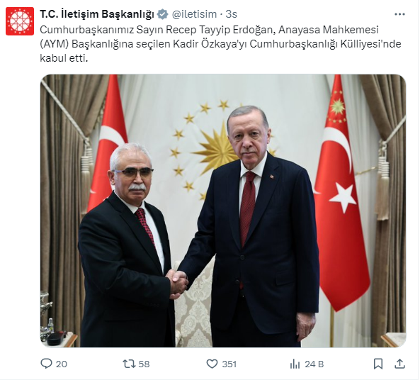 İletişim Başkanlığı sosyal medya( twitter)hesabından:'' Cumhurbaşkanımız Sayın Recep Tayyip Erdoğan, Anayasa Mahkemesi (AYM) Başkanlığına seçilen Kadir Özkaya'yı Cumhurbaşkanlığı Külliyesi'nde kabul etti.''şeklinde duyurdu.