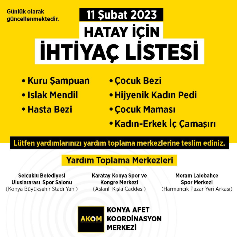 Başkan Altay, "Deprem Bölgesinde acil ihtiyaç listemiz aşağıdadır. Listeyi her gün güncelleyip duyuracağız. Yardımlarınızı Meram-Karatay-Selçuklu toplama merkezlerine teslim edebilirsiniz. Bireysel olarak bölgeye gelmeyin lütfen. Elden ele yayalım arkadaşlar" ifadelerine yer verdi.