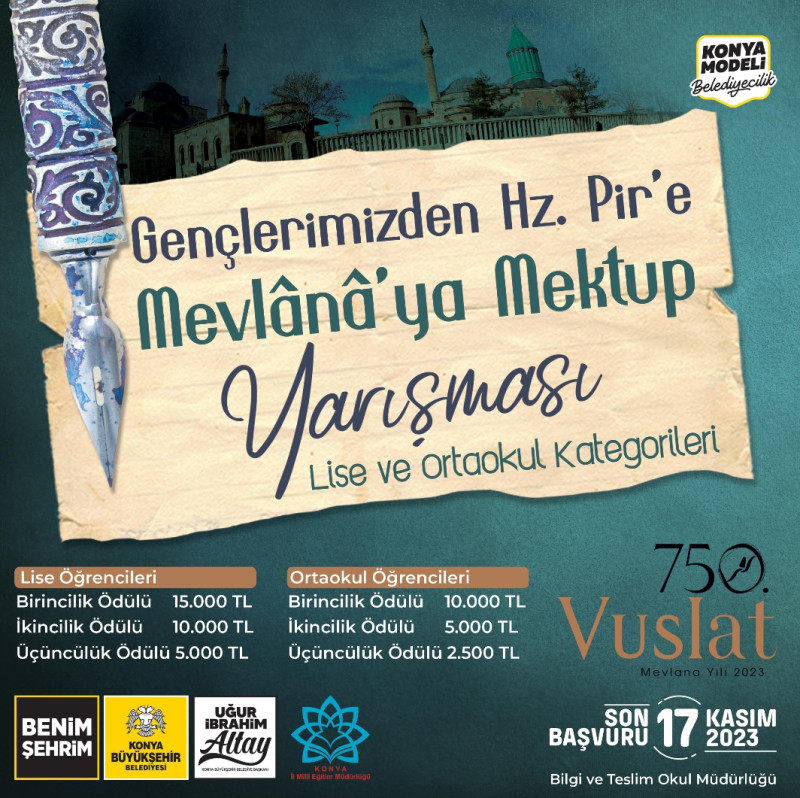 Konya genelindeki ortaokul ve lise öğrencilerine yönelik düzenlenen “Gençlerimizden Hz. Pîr’e (Mevlana’ya) Mektup” yarışmasıyla, kültür mirasımızın en canlı unsurlarından olan Hz. Mevlana Celaleddin-i Rumî’nin genç nesillere daha iyi tanıtılması ve öğrencilerin onun fikir dünyasıyla tanıştırılması amaçlıyor. Öğrencilerin mektuplarını 17 Kasım’a kadar okul müdürlüklerine teslim etmesi gerekiyor. Yarışmayla ilgili detaylı bilgiye mevlanayamektup.konya.bel.tr adresinden ulaşılabiliyor.