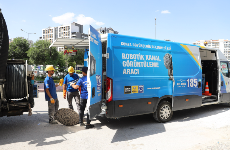 Konya Büyükşehir Belediyesi KOSKİ Genel Müdürlüğü, kanalizasyon şebekelerinin sıhhatli çalışması ve yağışlı havalarda muhtemel taşkınların önlenmesi amacıyla kombine araçlarla kanalizasyon hatlarında temizlik çalışmaları yapıyor.