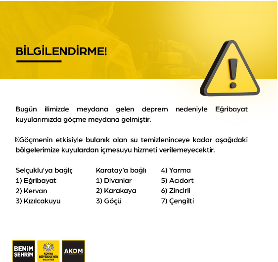 Konya Büyükşehir Belediyesi Afet Koordinasyon Merkezi, deprem sonrası su hatlarında oluşan göçükler nedeniyle uyarıda bulundu. Konuya ilişkin AKOM'dan yapılan açıklamada, "Bugün meydana gelen deprem sonrası Eğribayat grup su kuyularında göçme meydana gelmiş ve suları bulanmıştır. Depremin etkisiyle bulanan su temizleninceye kadar kuyulardan içme suyu hizmeti verilemeyecektir. Vatandaşlarımızın gerekli tedbiri almaları önemle rica olunur" ifadeleri kullanıldı.