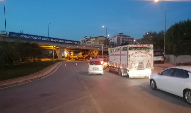 Meram Belediyesi ile Gar güzergahındaki Tapu alt geçidinde kabari ihlali yapan ve üst geçide çarparak yan yatan kamyon yolu tamamen kapattı.