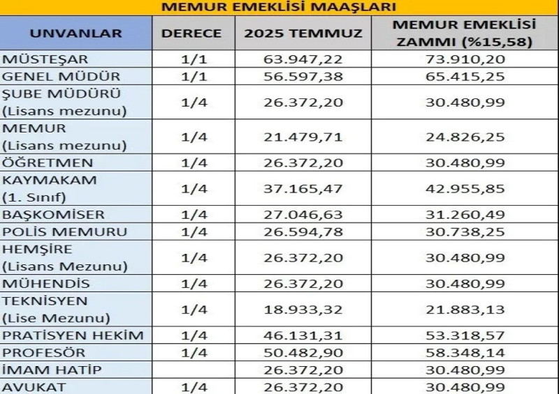 Ocak 2025'te aile yardımı ödeneği dahil en düşük memur maaşı 39 bin 177 liradan 43 bin 726 liraya, en düşük memur emekli aylığı 17 bin 587 liradan 19 bin 617 liraya yükseldi. En düşük memur emeklisi maaşı bu hesaba göre 20 bin 325 lira oldu. En düşük memur emeklisi maaşı 50 bin liranın üzerine çıkarak 50 bin 534 lira oldu.