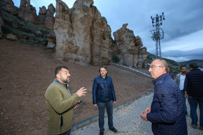 Meram belediyesi’nin, doğal güzellikleriyle ünü Konya ve ülke sınırlarını aşmış Meram Dere’nin peri bacaları Kızlar Kayası’nı turizme kazandırmak için başlattığı çalışmalarda sona yaklaşıldı. Dere Mahallesi’nde bulunan bölgede gerçekleştirilen revizyon, çevre düzenlemesi ve ışıklandırma çalışmalarının hızla ilerlediğini kaydeden Meram Belediye Başkanı Mustafa Kavuş, düzenleme çalışmalarını yerinde inceleyerek projenin durumu hakkında bilgi aldı. Kızlar Kayası düzenlemesinin Meram Son Durak Çamlıbel mevkisinden başlayan tarih ve turizm rotasının en önemli çalışmalarından biri olduğunu söyleyen Başkan Kavuş, proje tamamlandığında alanın, Meram’ın cazibe merkezi yerlerinden biri olacağına dikkat çekti.