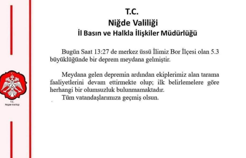 Niğde'nin Bor ilçesinde 5,3 büyüklüğünde bir deprem meydana geldi.