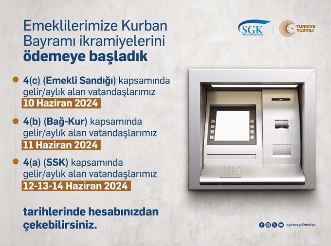 Sosyal Güvenlik Kurumu (SGK), emekli ikramiyesi hakkında duyuruda bulundu. Yapılan açıklamada, "Emeklilerimizin Kurban Bayramı ikramiyelerini bugün ödemeye başlıyoruz" ifadelerine yer verildi.