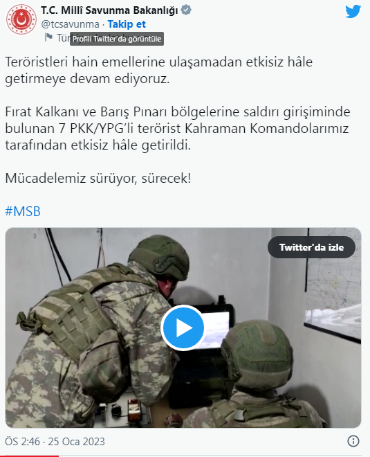 Milli Savunma Bakanlığı'ndan yapılan açıklamada, "Teröristleri hain emellerine ulaşamadan etkisiz hâle getirmeye devam ediyoruz. Fırat Kalkanı ve Barış Pınarı bölgelerine saldırı girişiminde bulunan 7 PKK/YPG'li terörist Kahraman Komandolarımız tarafından etkisiz hâle getirildi. Mücadelemiz sürüyor, sürecek!" ifadeleri kullanıldı