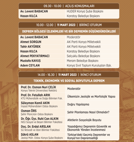 Depremin ilk gününden beri Hatay’daki çalışmaların koordine edilmesinde büyük gayret gösteren AK Parti Konya Milletvekilleri Ahmet Sorgun ve Tahir Akyürek, Karatay Belediye Başkanı Hasan Kılca, Selçuklu Belediye Başkanı Ahmet Pekyatırmacı, Meram Belediye Başkanı Mustafa Kavuş ile Konya Sivil Toplum Kuruluşları Platformu Başkanı Adem Ceylan; çalıştayın ilk günün birinci oturumunda “Deprem Bölgesi İzlenimleri ve Bir Depremin Düşündürdükleri” başlığında bölgeyi anlatacaklar. Söz konusu oturumun moderatörlüğünü ise HUDER Konya Şubesi Başkanı Av. Levent Babacan yapacak.