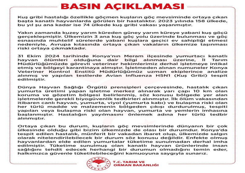 Ortaya çıkan bu durum, kuşların göç mevsimlerinde dünyanın birçok Ülkesinde olduğu gibi bizim ülkemizde de olası bir durumdur. Konya'da tespit edilen hastalık, münferit bir vakadan ibaret olup, ülkemizde salgın olarak nitelendirilebilecek bir durum söz konusu değildir. Enfekte olmuş hayvanlardan elde edilen yumurtalar tüketime sunulmadan derhal imha edilmiştir. Tüketime sunulmuş olan kanatlı hayvan ürünlerinde insan sağlığını tehdit edecek herhangi bir durumun olmadığını temin eder, halkımızca güvenle tüketilebileceğini kamuoyuna saygıyla sunarız.''