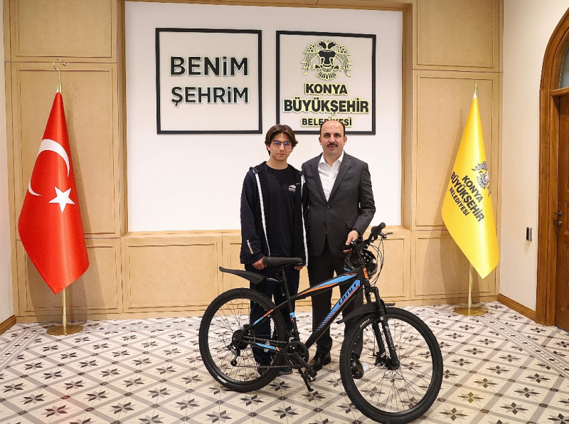 Konya Büyükşehir Belediye Başkanı Uğur İbrahim Altay, ters dönen güzergah tabelasını uzun uğraşlar sonucu düzelten 17 yaşındaki liseli Yusuf Dağtaş’a bisiklet hediye etti.