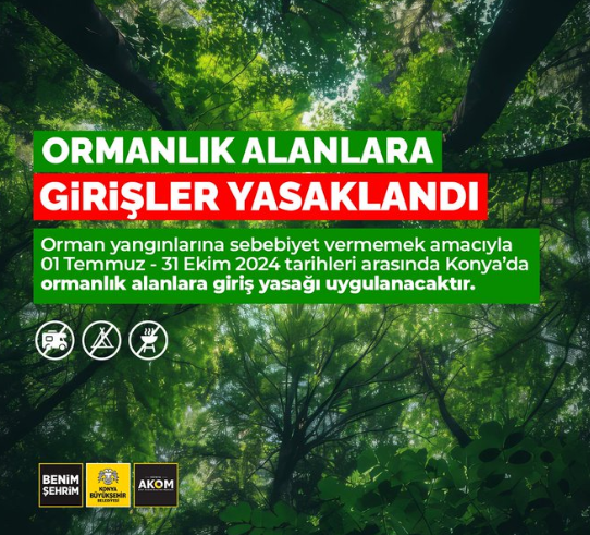 Konya AKOM sosyal medya hesabından Konya’daki ormanlık alanlarının 1 Temmuz - 30 Eylül tarihleri arasında yasaklandığını duyurdu. Konya AKOM:’’ Hava sıcaklıklarının mevsim normallerinin üzerinde seyretmesi nedeniyle ormanlarımızı olası yangınlardan korumak için Konya sınırları içerisinde bulunan ormanlık alanlara girişler 1 Temmuz - 30 Eylül tarihleri arasında yasaklanmıştır. Ormanlara giriş konusunda uyarıları dikkate almayan kişilere idari ve adli işlem uygulanacaktır. Gelin, hep birlikte ülkemiz ve milletimiz için paha biçilemez ormanlarımızı koruyalım. ’dedi