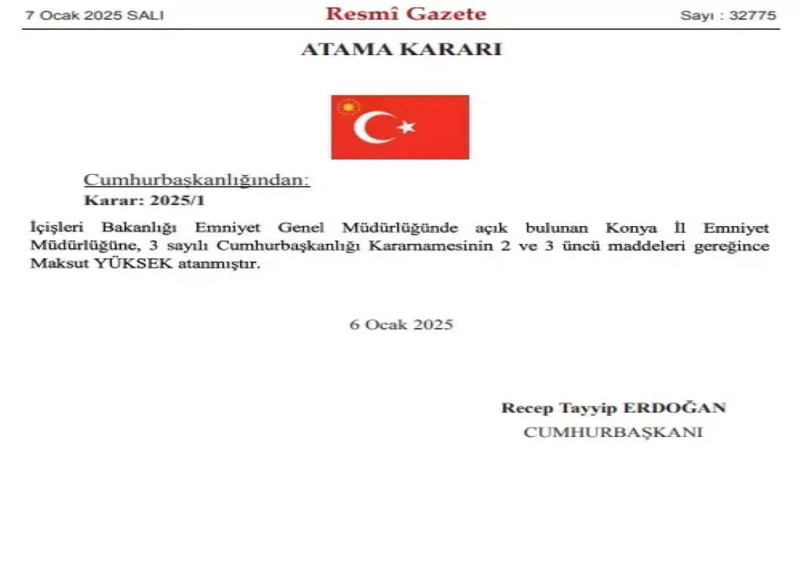 Cumhurbaşkanlığı tarafından yapılan atamalar Resmi Gazete'de yayımlandı. Cumhurbaşkanı Recep Tayyip Erdoğan'ın imzasıyla yayımlanan kararname ile Konya İl Emniyet Müdürlüğü görevine Maksut Yüksek atandı.
