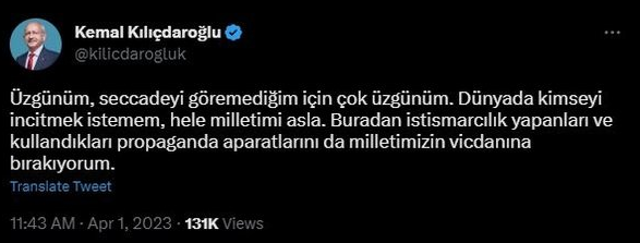 7'li koalisyonun Cumhurbaşkanı adayı Kemal Kılıçdaroğlu, Müslümanların namaz kılarken secde etmek için kullandıkları seccadeye ayakkabı ile basarak büyük bir saygısızlığa imza attı. Gece boyu vatandaşlar Kılıçdaroğlu'na büyük tepki gösterdi. CHP'nin trol hesapları fotoğrafın fotoşop olduğunu belirterek savunmaya geçerken, FETÖ'cü hesaplar da büyük destek verdi. Fotoğrafın gerçek olduğunun netleşmesi ile bu kez de 'Seccadeye ayakkabı ile basılmasında bir sakınca yok' savunmasına geçildi. CHP adına açıklamayı, fondaş gazeteci İsmail Saymaz yaparken, Kılıçdaroğlu gece boyu sessiz kaldı. Kılıçdaroğlu bugün ise, özrü kabahatinden büyük bir açıklama yaptı. Kendisini eleştirenleri 'propaganda aparatı' olarak nitelendiren Kılıçdaroğlu, konunun istismar edildiğini iddia etti.