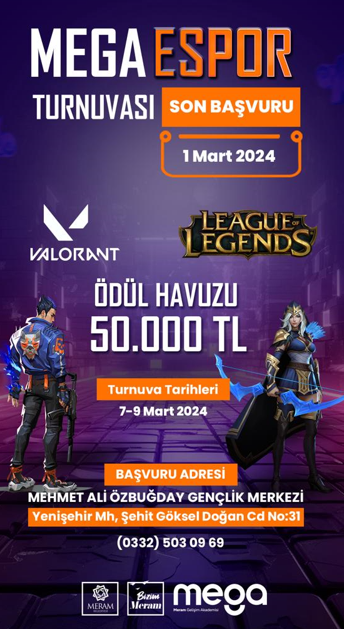 Konya’nın ilk e-spor Merkezi olma özelliğine sahip Meram MEGA e-spor merkezi, oyun tutkunlarını heyecanlı bir turnuvayla bir araya getirmeye hazırlanıyor. 7-9 Mart tarihleri arasında yapılacak ödüllü turnuvada takımlar, League of Legends (LoL) ve Valorant oyunlarında karşı karşıya gelecek. Finallerin Mehmet Ali Özbuğday Gençlik Merkezi’nde yapılacağı turnuva için başvurularda son gün 1 Mart Cuma günü.