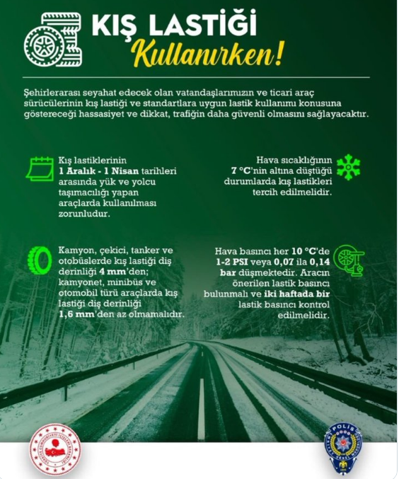 Yük ve yolcu taşımacılığı yapanlar dışındaki hususi araçlar için uygulama zorunlu değil ancak can ve mal güvenliğiyle sorunsuz seyahat için kış şartlarında tüm araçlarda kış lastiği kullanılması önem taşıyor.
