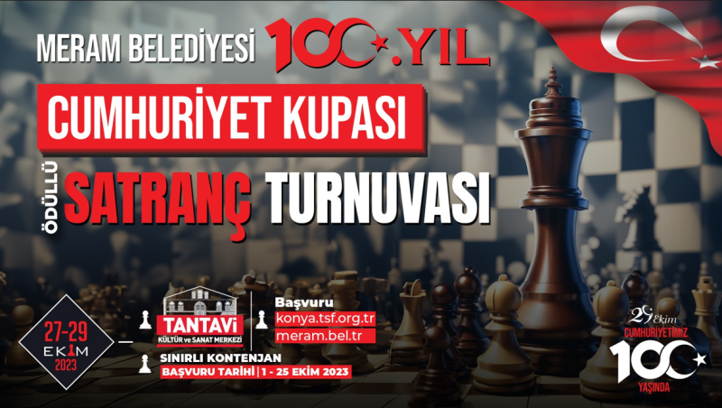 Meram Belediyesi, Cumhuriyet’in 100. yılı etkinlikleri kapsamında satranç turnuvası düzenliyor. ‘Meram Belediyesi 100. Yıl Cumhuriyet Kupası Ödüllü Satranç Turnuvası’ 27-29 Ekim tarihleri arasında gerçekleştirilecek. Meram Belediyesi, Gençlik ve Spor Bakanlığı ve Türkiye Satranç Federasyonu iş birliğinde gerçekleştirilecek turnuvada satranç severler Tantavi Kültür ve Sanat Merkezi’nde kıyasıya yarışacak. Müracaatları 1 Ekim tarihinde başlayan turnuvanın son başvuru tarihi ise 25 Ekim Çarşamba. Meram Belediyesi’nden yapılan açıklamada başvuruların, konya.tsf.org.tr ve meram.bel.tr internet adresi üzerinden yapılabileceği bildirildi. Yapılan açıklamada ayrıca şu bilgiler yer aldı: “Kayıtları 1 Ekim itibariyle başlayan turnuvaya Gençlik Spor il ve ilçe müdürlüklerinden çıkartılan TSF lisansına sahip, 2023-2024 yılı vizesi yapılmış 2017 ve önceki yıllarda doğmuş sporcular katılabilecek. Her kategoride ilk 60 sporcu asıl, sonrasındaki kayıtlar ise yedek olacaktır. Yedek sporcular kayıt kontrol sonrası gelmeyen asıl sporcuların yerine sırayla turnuvaya dahil edilecektir. Turnuva, “8 yaş ve altı, 10 yaş ve altı, 12 yaş ve altı, 16 yaş ve altı ile açık” olmak üzere 5 ayrı kategoride gerçekleştirilecektir.
