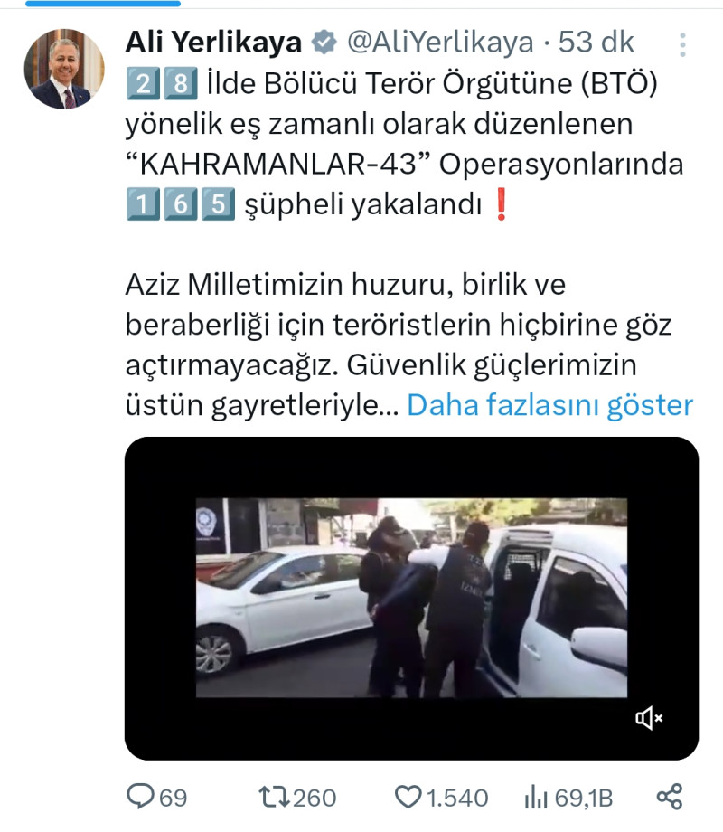 "Aziz milletimizin huzuru, birlik ve beraberliği için teröristlerin hiçbirine göz açtırmayacağız. Güvenlik güçlerimizin üstün gayretleriyle mücadelemize aralıksız devam edeceğiz." ifadesini kullanan Yerlikaya, operasyonlara ilişkin şu bilgileri verdi: