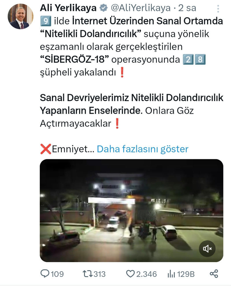 İçişleri Bakanı Ali Yerlikaya, 9 ilde düzenlenen, internet üzerinden sanal ortamda nitelikli dolandırıcılık suçuna yönelik eş zamanlı gerçekleştirilen 'Sibergöz-18' operasyonunda 28 şüpheli yakalandığını açıkladı.