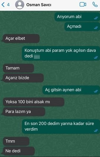 Ele geçirilen WhatsApp konuşmalarında, örgüt üyesinin savcının talimatıyla bir doktordan "takipsizlik kararı" karşılığında para istediği yer alırken, örgüt üyesi ile savcı arasında geçen diyalog şöyle: