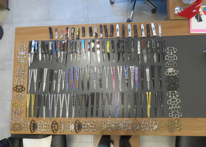 Özellikle gençler arasında özenti haline dönüşerek taşınan ve toplum içerisinde korku, paniğe neden olan bıçak, kesici ve delici aletlerle ilgili ekipler, 7/24 denetim gerçekleştiriyor.