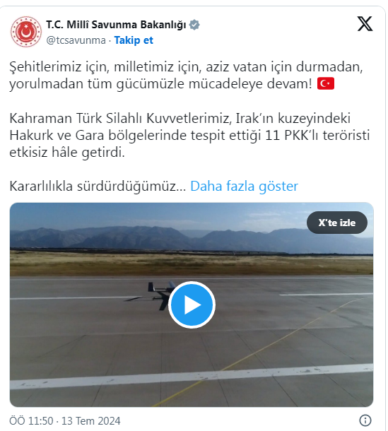 Şehitlerimiz için, milletimiz için, aziz vatan için durmadan, yorulmadan tüm gücümüzle mücadeleye devam! Kahraman Türk Silahlı Kuvvetlerimiz, Irak'ın kuzeyindeki Hakurk ve Gara bölgelerinde tespit ettiği 11 PKK'lı teröristi etkisiz hâle getirdi. Kararlılıkla sürdürdüğümüz operasyonlarımız, en son terörist etkisiz hâle getirilinceye kadar sürecek!