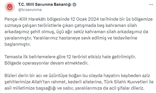 Pençe-Kilit Harekâtı bölgesinde 12 Ocak 2024 tarihinde bir üs bölgemize sızmaya çalışan teröristlerle çıkan çatışmada beş kahraman silah arkadaşımız şehit olmuş, üçü ağır sekiz kahraman silah arkadaşımız da yaralanmıştır. Yaralılarımız hastaneye sevk edilmiş ve tedavilerine başlanmıştır.