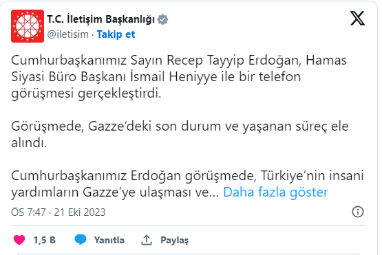 Başkan Recep Tayyip Erdoğan, Hamas Siyasi Büro Başkanı İsmail Heniyye ile bir telefon görüşmesi gerçekleştirdi.