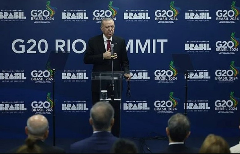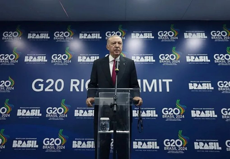 Cumhurbaşkanı Recep Tayyip Erdoğan, Brezilya'da düzenlenen G-20 Zirvesine ilişkin açıklamalarda bulundu. Gazze'de yaşanan vahşete dikkat çeken Başkan Erdoğan, "Bu zulme sessiz kalanları tarih affetmeyecektir." dedi. İsrail'e karşı zorlayıcı tedbirler uygulanmasının şart olduğunu vurgulayan Erdoğan, Trump yönetimine de "Yeni Amerikan yönetiminin barışa giden yolda daha destekleyici adımlar atmasını temenni ediyorum." çağrısında bulundu. Erdoğan, Brezilya'nın Rio De Janeiro kentinde düzenlenen G20 Liderler Zirvesi'ndeki temaslarını tamamlamasının ardından basın toplantısı düzenledi. Zirveye ev sahipliği yapan Brezilya Devlet Başkanı Lula da Silva'ya şahsı, eşi ve heyete gösterdikleri hüsnükabul için teşekkür eden Erdoğan, zirve kapsamında, dönem başkanının davetlisi olanlarla birlikte 35'i aşkın ülkenin devlet ve hükümet başkanlarıyla, uluslararası teşkilatların temsilcileriyle bir araya geldiklerini söyledi.