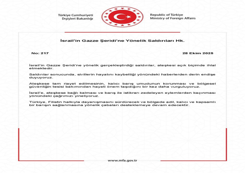 Türkiye Cumhuriyeti Dışişleri Bakanlığı, İsrail’in Gazze Şeridi’ne yönelik son saldırılarına ilişkin yazılı bir açıklama yayımladı. Bakanlık, saldırıların ateşkesi açık biçimde ihlal ettiğini belirterek, sivillerin hayatını kaybettiği yönündeki haberlerden derin endişe duyulduğunu ifade etti.