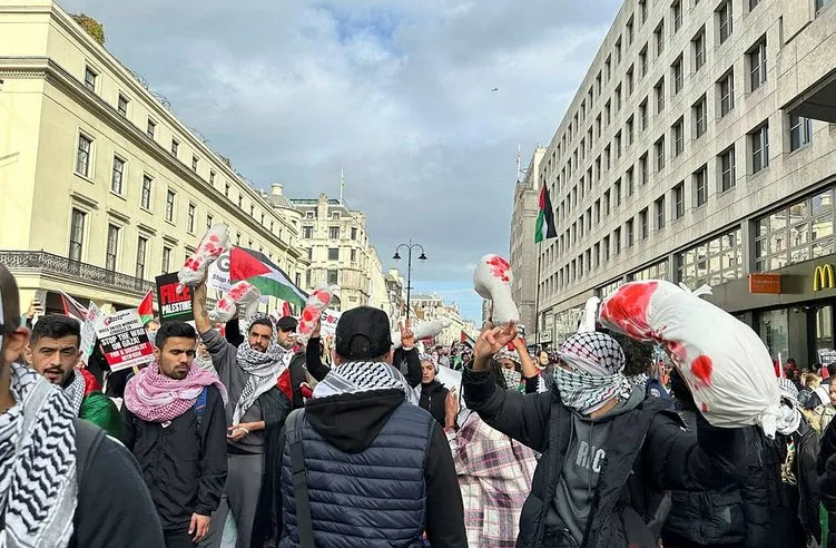 İngiltere'nin başkenti Londra'da, Filistin'e destek gösterisi düzenledi. Göstericiler, Filistin bayrakları ve ateşkes çağrısı içeren pankartlar taşıdı.