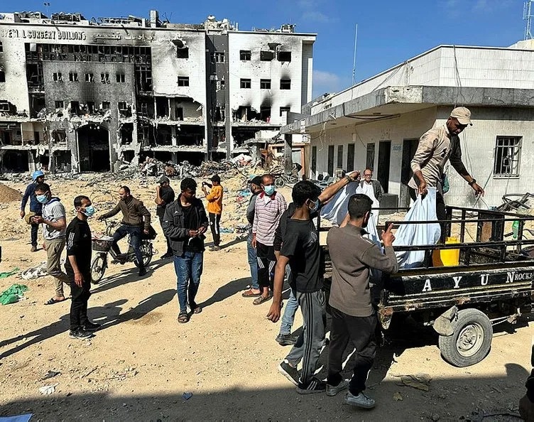 İsrail ordusunun baskın düzenleyerek 2 hafta boyunca yüzlerce Filistinliyi öldürdüğü ve harabeye çevirdiği Gazze kentindeki Şifa Hastanesi avlusunda 10 cesedin yer aldığı toplu mezar bulundu.