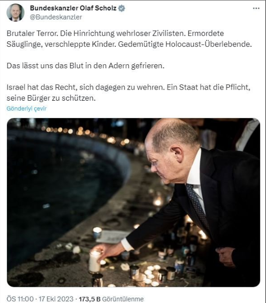 Öte yandan Scholz bugün, Hamas'ın saldırıları karşısında destek amacıyla İsrail'i ziyaret etti. Almanya hükümeti ve parlamentosunun İsrail'in yanında olduğunu belirten Scholz, "İsrail'de benim için şunu vurgulamak çok önemli. Alman tarihi ve Holokost tarihi, bize İsrail'in güvenliğini destekleme sorumluluğu yüklüyor." ifadesini kullandı.