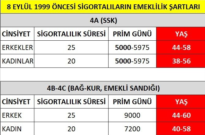 Tabloda 8 Eylül 1999 düzenlemesi öncesi sigorta girişi olanların günümüz şartlarında emekli olabilme şartlarını içeriyor.