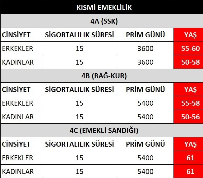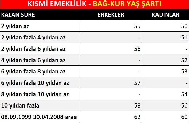 Bağ-Kur'da kısmi emeklilikle 1 Ekim 1999 tarihinden itibaren emekliliğine 2 yıl ve daha az kalan sigortalılar, 5.400 gün prim günle emekli olabilecek. Burada erkeklerde yaş şartı 55, kadınlarda ise 50 olarak dikkat çekiyor.