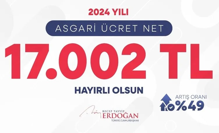 "2024 yılında asgari ücret, %49 artışla net 17.002 TL olarak uygulanacaktır. Ülkemize ve milletimize hayırlı olsun."